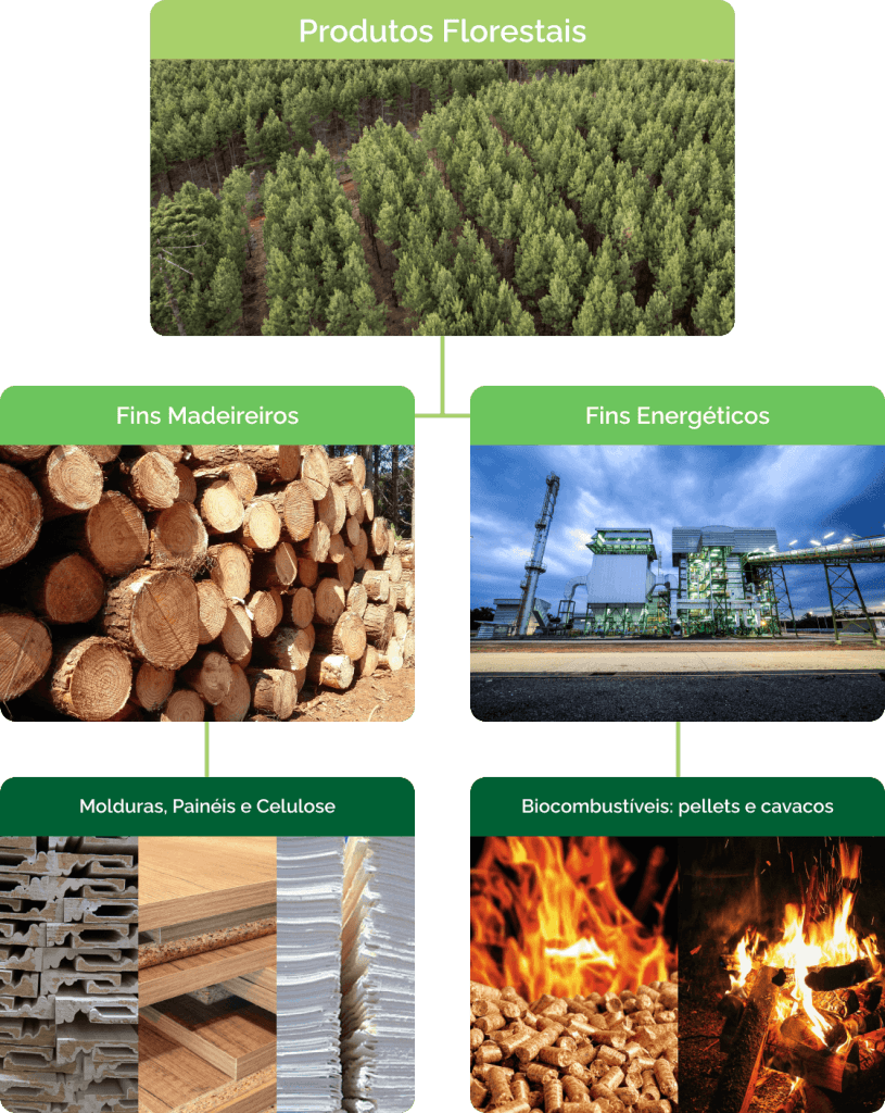 Após o processo de beneficiamento, a madeira é destinada a diversos tipos de segmentos, sendo a fabricação de papel e embalagens de madeira (pallets), destinadas ao armazenamento e transporte de produtos, usualmente de grande porte entre grandes distâncias.